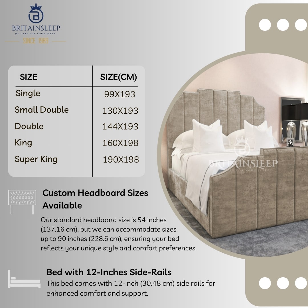 Imagine sinking into the plush comfort of your Crown bed, enveloped by the vertical lined headboard. Its exquisite upholstery, available in a symphony of sumptuous fabrics and colours, sets the tone for a truly royal slumber experience.
