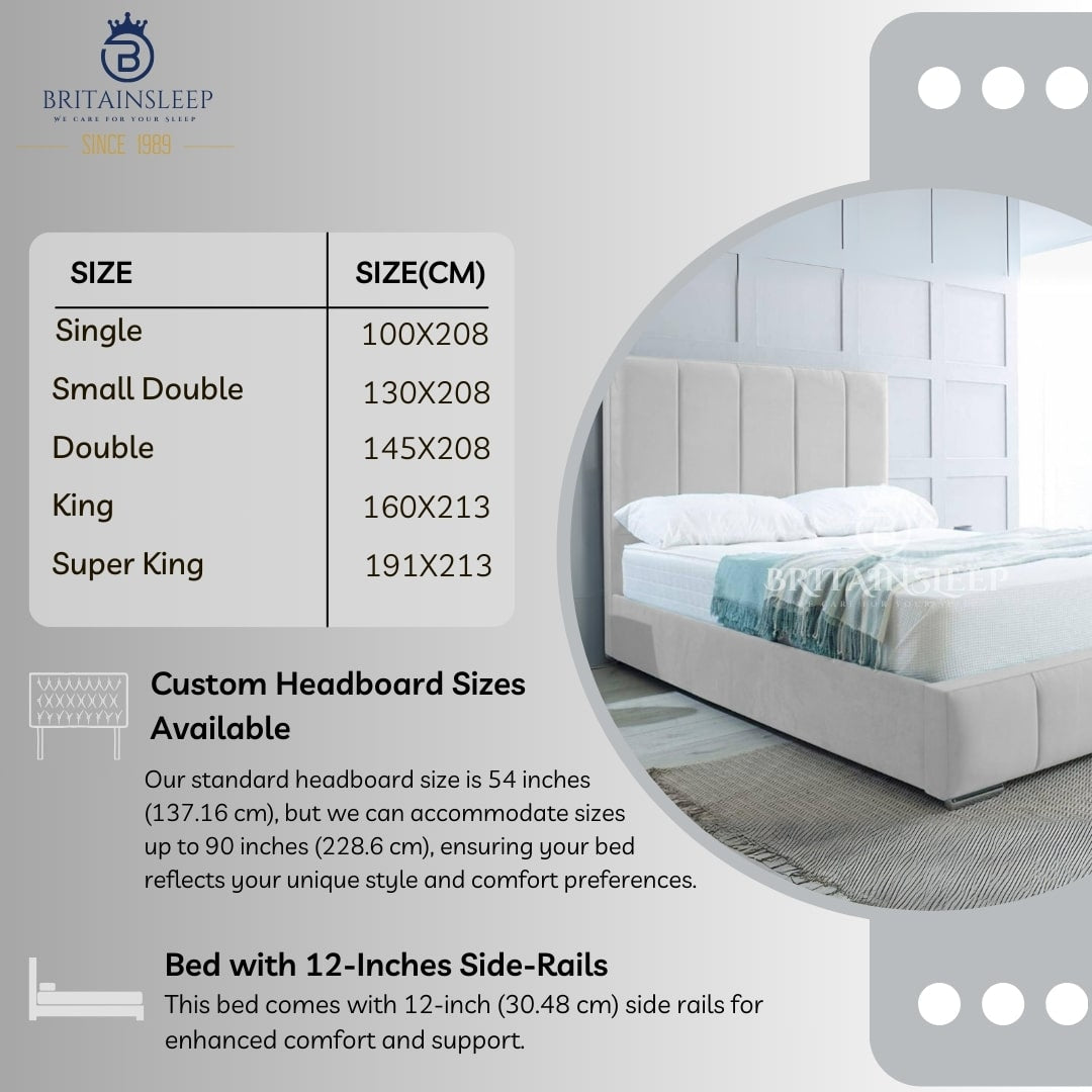Our standard headboard size is 54 inches (137.16 cm), but we can accommodate sizes up to 90 inches (228.6 cm), ensuring your bed reflects your unique style and comfort preferences.