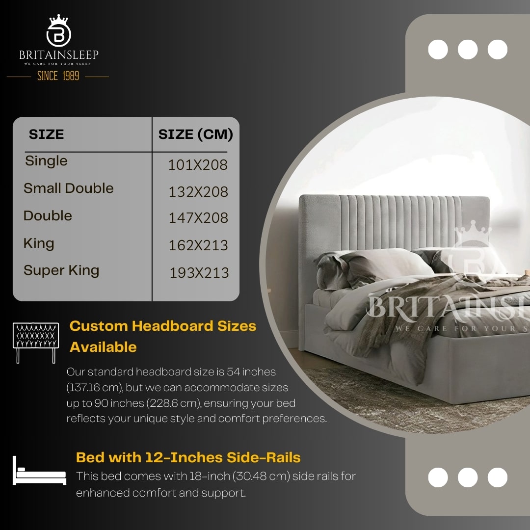 Our standard headboard size is 54 inches (137.16 cm), but we can accommodate sizes up to 90 inches (228.6 cm), ensuring your bed reflects your unique style and comfort preferences.