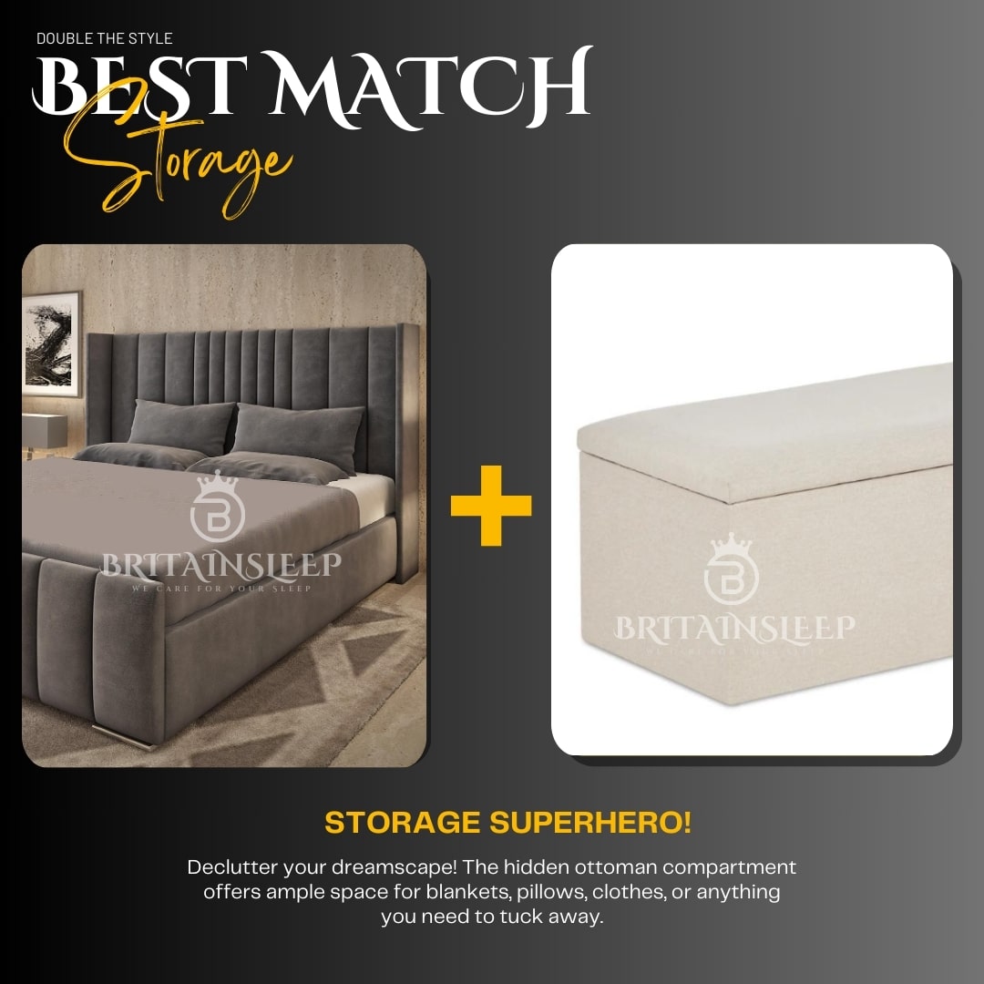 The sleek design of the bed complements the hidden functionality of the ottoman, creating a visually stunning focal point for your bedroom.