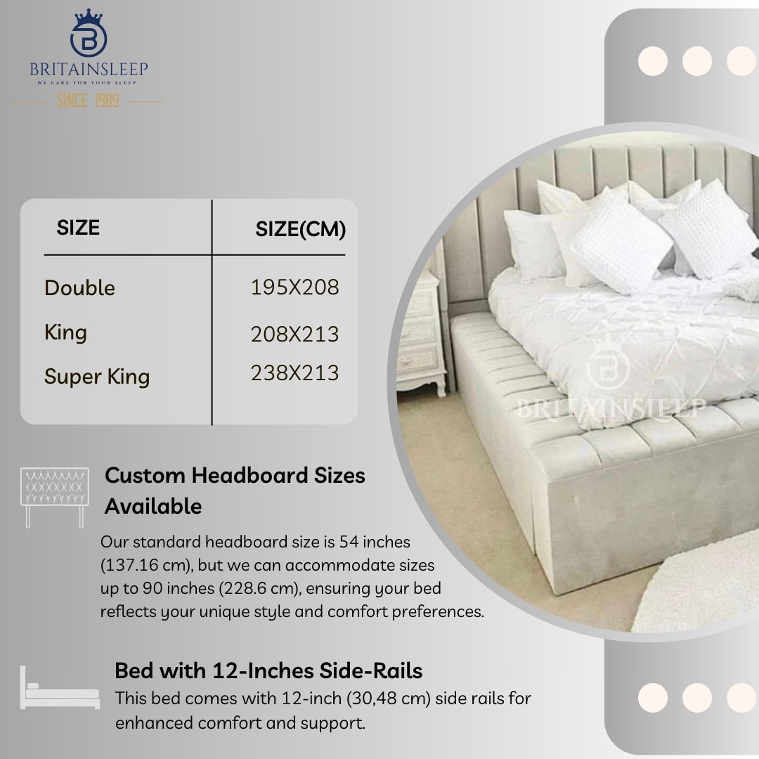 The Ambassador bed epitomizes luxury beyond its vertical channel tufting headboard and footboard. Crafted with meticulous attention to detail by our skilled artisans in the UK, the thickly padded matching Side Rails seamlessly enhance the opulent comfort of this masterpiece.